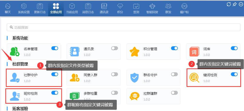 首先我们点击顶部的【全部应用】,然后找到【社群管理】菜单里面的【键词检测】,把此插件的开关打开,然后再点击进入。
