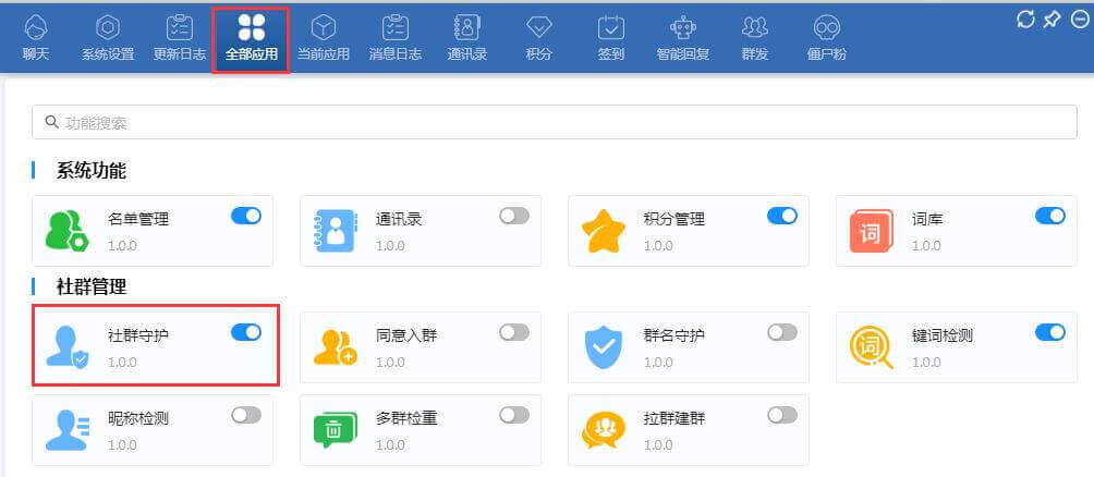 首先我们点击顶部的【全部应用】,然后找到【社群管理】菜单里面的【社群守护】,把此插件的开关打开,然后再点击进入。