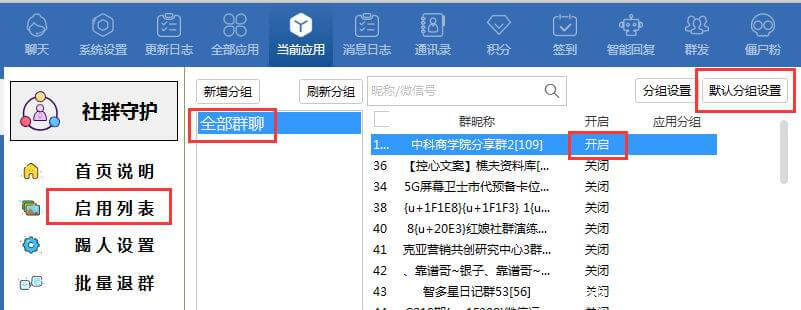 选择社群守护【启用列表】菜单,点击全部群聊,选择需要监控的微信群,如图右击选择【开启此群】,就可以选中需要守护的群。然后右上角的【默认分组设置】菜单,进入具体规则设置界面(如下图)