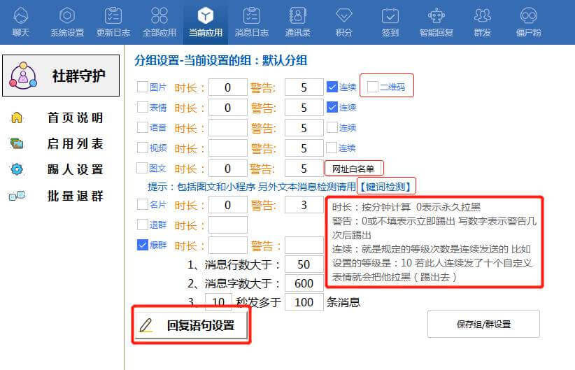 3、踢人后还会自动发回复语,点击【回复语句设置】菜单,即可进行详细设置。(如下图)
