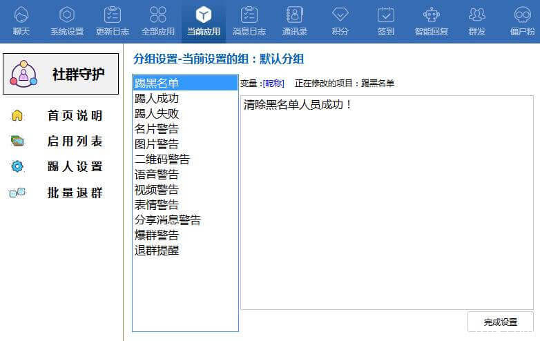 C、选择【系统设置】菜单,可以设置踢人、警告的话术,自动发出去
