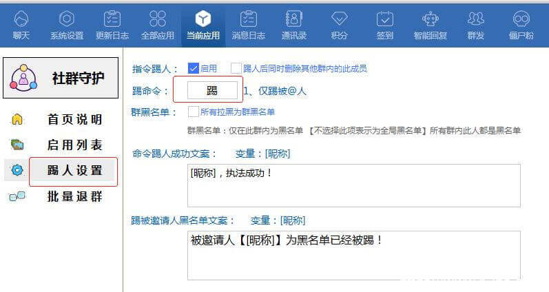 4、当群内成员没有发生我们指定的违规类型,还可以进行手工命令踢人。点击踢人设置即可设置相应的规则。(如下图)