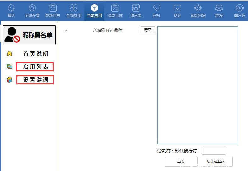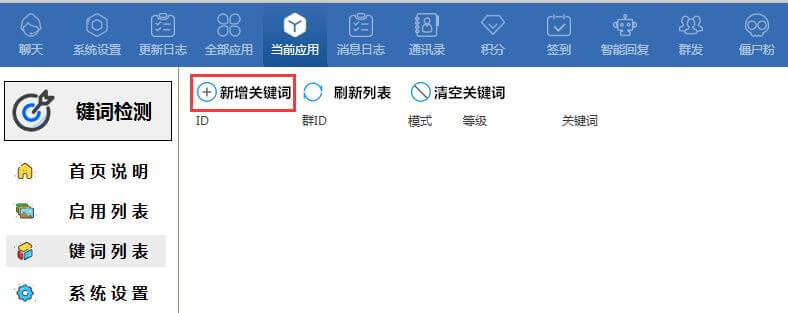 A、选择【启用列表】菜单,可以设置那些群需要启用关键词检测功能。