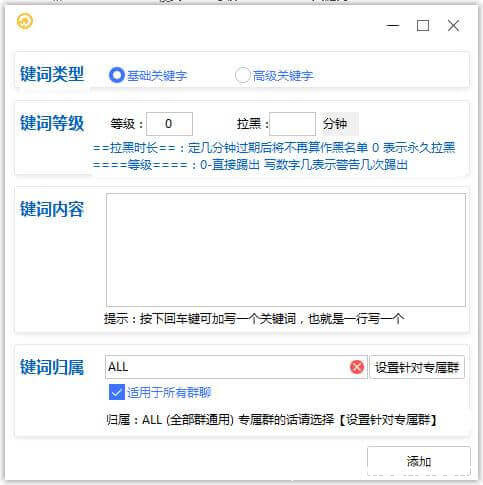 针对群好友,设置关键词,当发言人、进群好友的昵称包含这些关键词,可以自动踢出群。防止炸群!