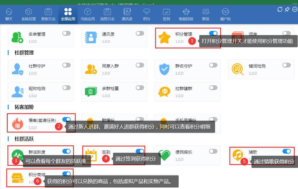 必销客积分统计主要来自以下数据:群成员邀请好友入群、群签到、猜歌。需要分别打开相应的插件,(如下图说明)