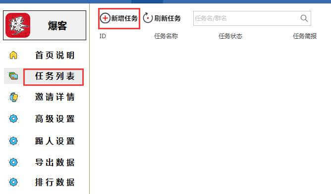 点击【爆客(邀请任务)】插件,选择任务裂变菜单,点击新增任务,如下图