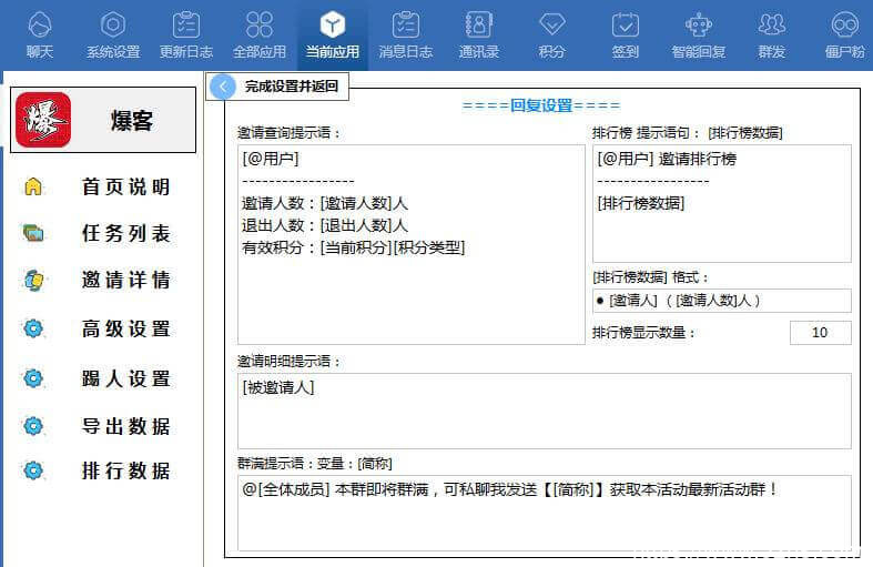 点击【回复话术】即可对群成员邀请好友进群以后的回复话术进行详细的设置:如下图