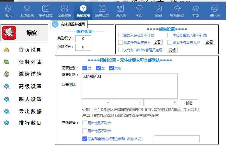 点击【其它限制和奖励】就可以对群成邀请好友进群进行更详细的设置,比如重复进群不重新增加积分等。如下图
